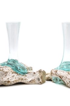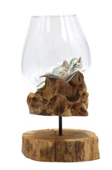 Molten Glass Large Bowl. Bring nature inside with these absolutely beautiful (and affordable) natural works of art, which your customers are really going to want to own.The glass is hand-blown and while still hot it is then relaxed over a piece of Gamal root, the glass then hardens to the shape of the wood ensuring a perfect fit. They are crafted using a natural product by using hand tools in the traditional Balinese way. It provides a one-of-a-kind setting for stones and air plants. Each item is unique as they are made from natural sustainable Gamal wood and the recycled glass is shaped to suit which add to its authenticity, your customer will love it. They can be used for house plants, zen gardens or floating candles. The wooden base has a cavity for the cable and bulb fitting. Bring nature inside with these absolutely beautiful (and affordable) natural works of art, which your customers are really going to want to own. Make a lovely natural display and grow some great sales.. order today.Bowl Size:H:19cm D:20cm; Capacity:3.700ml on the Wood Stand: H:26cm Weight: 1600g Bowl neck D:6cm Wooden base sizes: D:26 H:5 Weight: 3.400g Please note: That due to the handmade nature of this product, there can be small imperfections in the glass such as small bubbles, light scratches. Sizes and designs may vary slightly.Each Molten Glass comes complete with UK light fitting & LED Bulb.